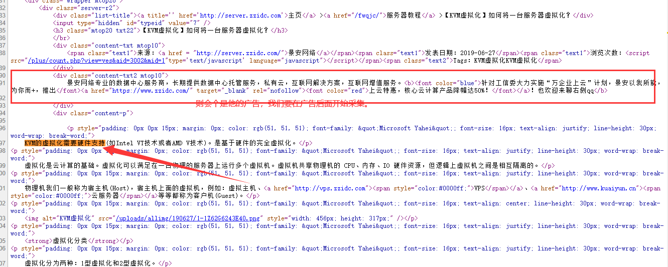 下面这个正文开始前的是他网站的广告,我们要在广告后面选取位置开始采集