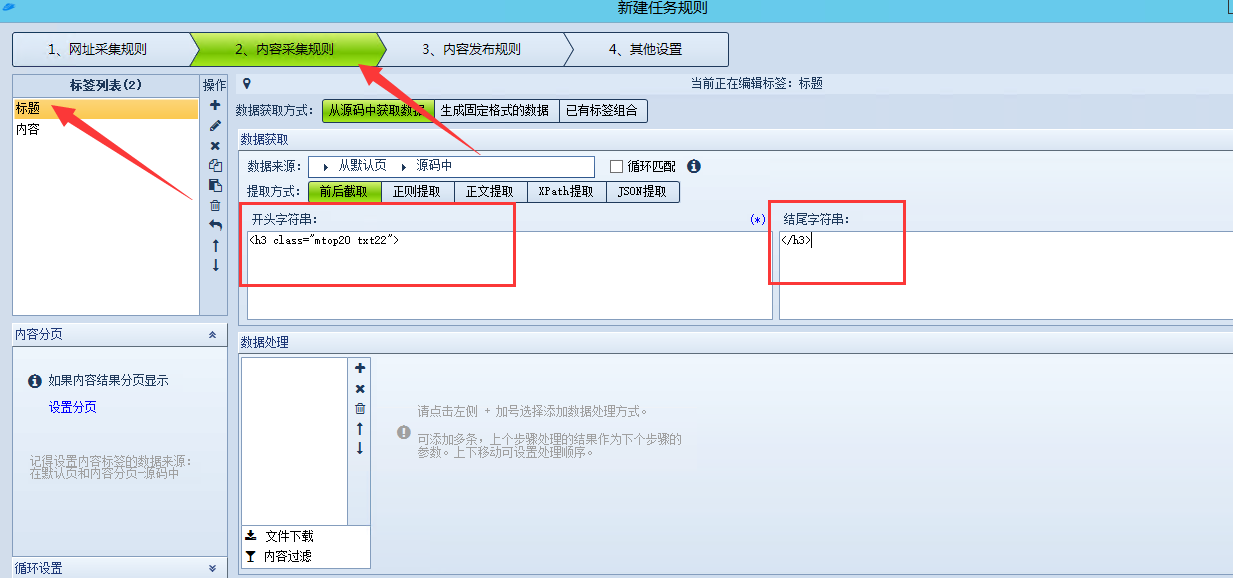 这两个字符串之间的内容,火车头会全采集下来,当做标题。所以不要选择错了