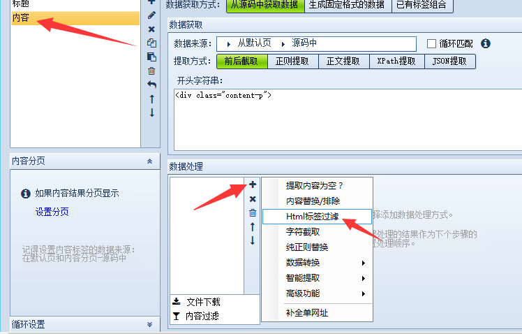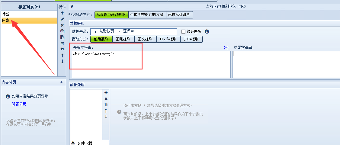将<div class=”content-p”>填入火车头正文采集规则的开头字符串