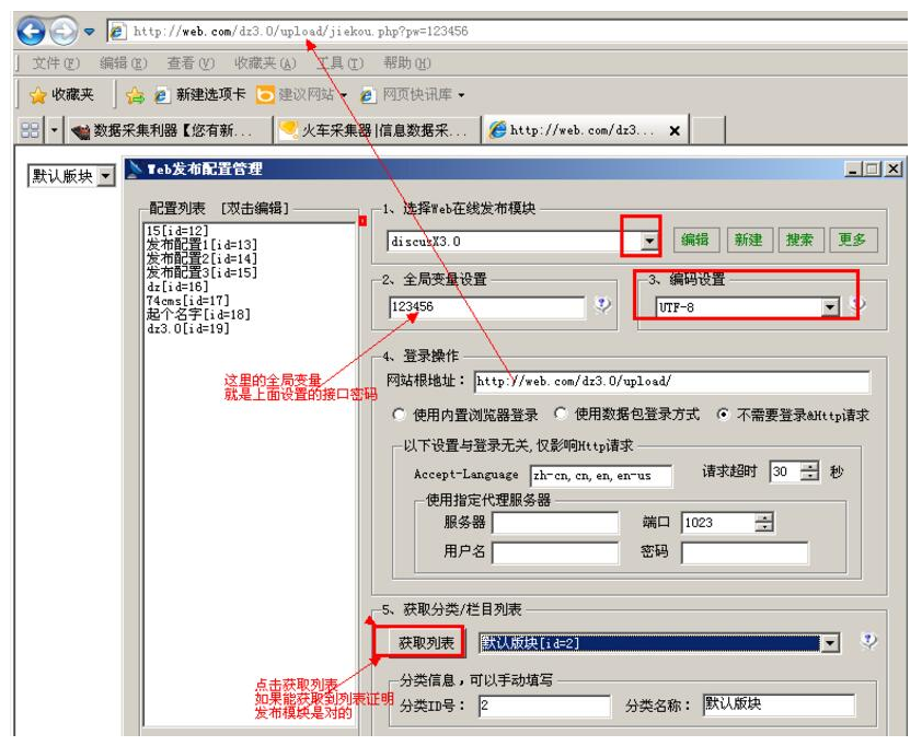 第五步:点击获取列表,如果能显示论坛版块就说明上面4步设置的正确。