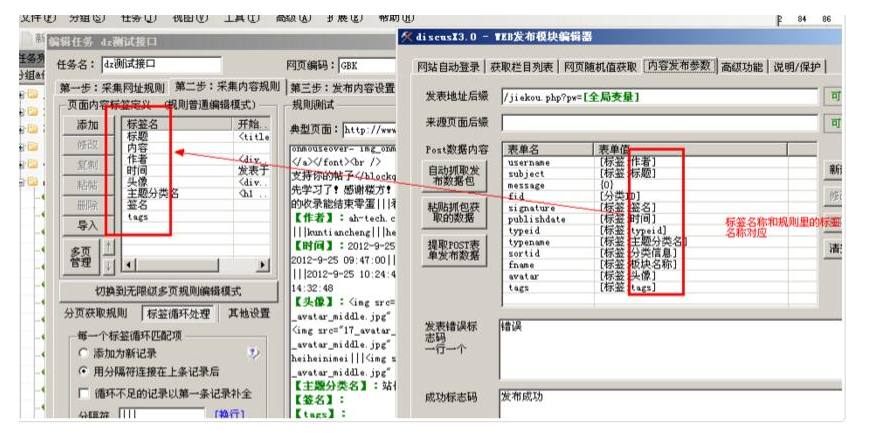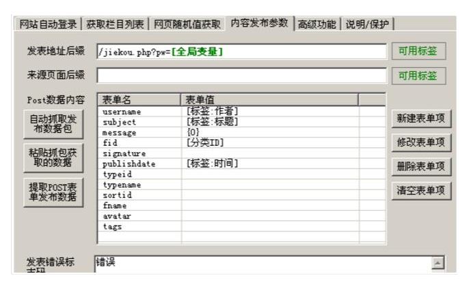意思就是我们建立一个标签名为fname,如果采集到的是“版块1”,那么就发布对应的版块id是1的版块里面,这个可以根据自己论坛版块进行修改,下面的typname也是同样的,这样设置的好处就是不需要设置分类id直接通过版块名称和主题分类名称自动对应上。