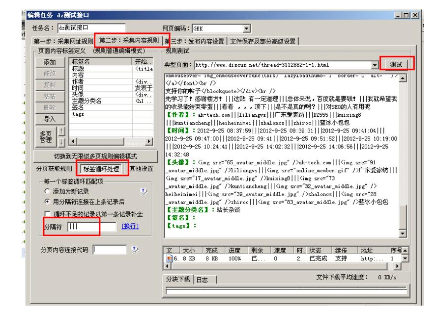 在第二步:采集内容规则,我们直接点击右侧的“测试”按钮,看下采集到的内容,这个规则是采集dz官方论坛。